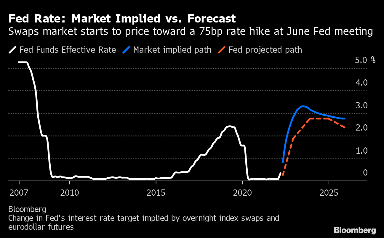 Finora questa settimana, i trader hanno ridotto le probabilità di un precipitoso aumento alla riunione di giugno. I contratti swap sono tornati a 109 punti base in più rispetto al tasso attuale, da un recente picco di 111 punti base. Ciò suggerisce circa una possibilità su tre di un aumento di 75 punti base il mese prossimo.