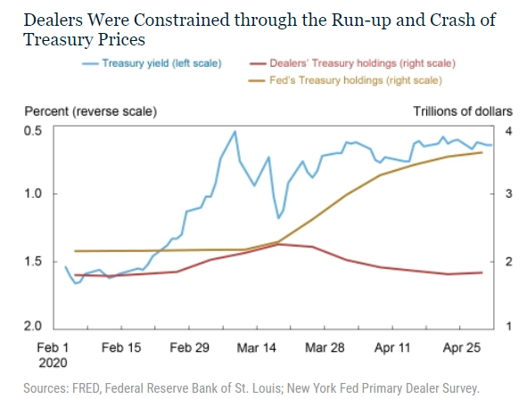 Il grafico seguente mostra che lo spazio di bilancio dei dealer allocato ai titoli del Tesoro è aumentato sia durante la corsa al rialzo dei prezzi delle obbligazioni che nel successivo crollo. Una volta che la Federal Reserve ha iniziato con il quantitative easing, i Treasury si sono ripresi. Ciò ha coinciso con la diminuzione della pressione sul bilancio dei dealer.