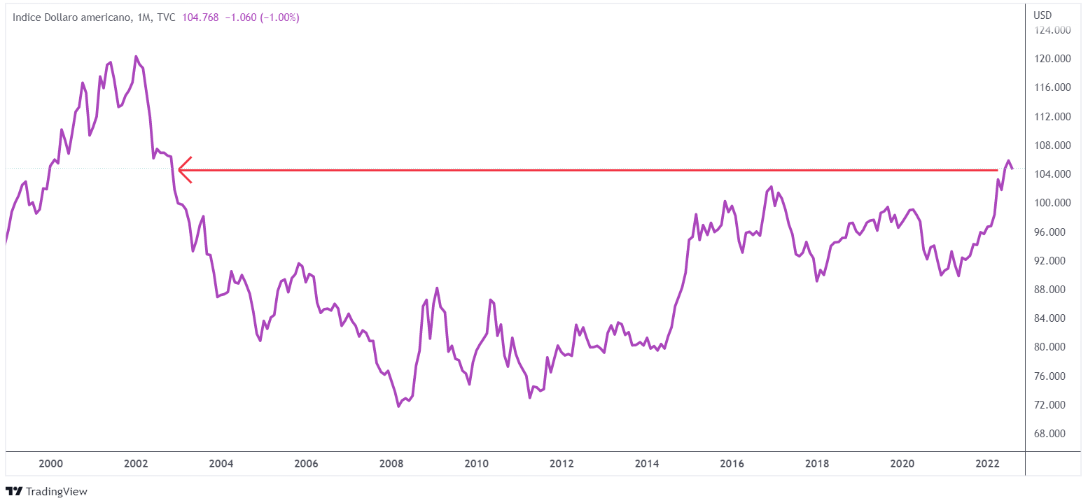 La forza del dollaro si è fatta sentire da un anno a questa parte. Dal minimo di maggio 2021 al suo picco recente, la valuta è aumentata del 14% rispetto a un ampio paniere di valute. Nonostante il ritracciamento recente, il dollaro è ancora forte e si trova vicino ai livelli più alti degli ultimi decenni rispetto alle principali valute del G7.