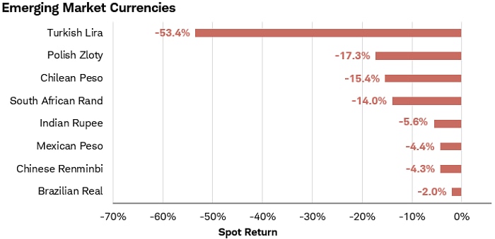 Molte valute dei mercati emergenti sono crollate rispetto al dollaro, alcune ai minimi storici. Sebbene il real brasiliano sia sceso solo del 2,0% rispetto al dollaro USA, la lira turca è scesa del 53,4%, lo zloty polacco è sceso del 17,3 % e il peso cileno è in calo del 15,4%.