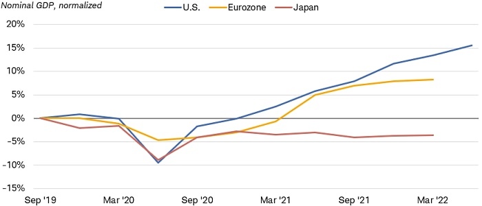 In termini nominali, il prodotto interno lordo statunitense è ora superiore del 15,6% rispetto al terzo trimestre del 2019, anche dopo il leggero calo registrato nella prima metà di quest’anno. Ciò si confronta con l’aumento dell’Eurozona di appena l’8,3% nello stesso periodo e con il 3,6% del PIL del Giappone.