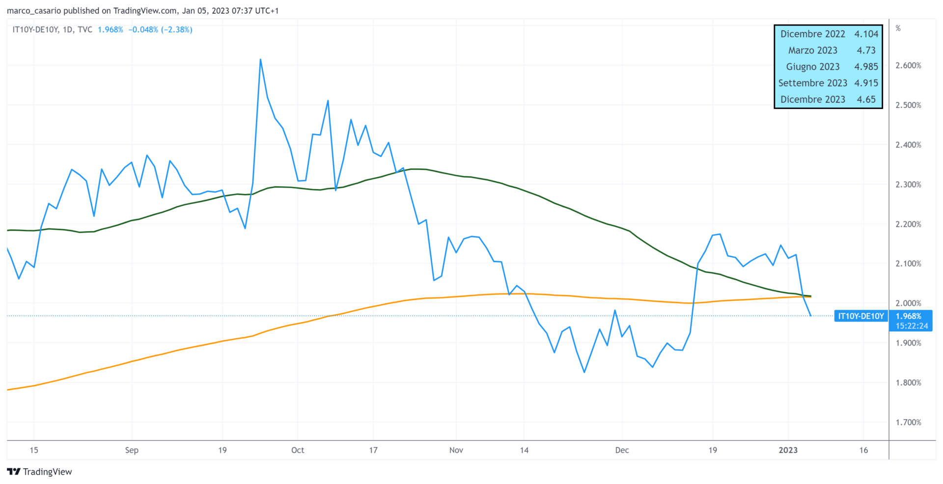 In Italia i rendimenti dei Titoli di Stato a 10 anni sono passati dal tetto del 4,7% al 4,25%. Ricordo che i Btp Italia già emessi sul mercato offrono rendimenti superiori al 7 per cento in quanto aggiustati all’inflazione. Ci si aspetta che col tempo questo valore scenda in quanto dovremmo essere vicini al picco dei prezzi al consumo e le politiche monetarie della Banca Centrale Europea dovrebbero cominciare a riflettersi nell’economia reale. Infatti i rendimenti sopratutto nelle durate piu’ brevi tendono ad essere piu’ influenzati dalle decisioni su tassi della BCE e ci si può aspettare che possano tornare a salire durante l’annuncio dei prossimi aumenti della Banca Centrale.