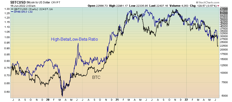 Da una prospettiva macro, i mercati delle criptovalute continuano a comportarsi come asset ad alto beta e stanno avendo lo stesso andamento del rapporto high beta/low beta. L’ultimo movimento al ribasso è in gran parte in linea con quanto dovremmo aspettarci data la flessione del ciclo di crescita e le prospettive di liquidità.