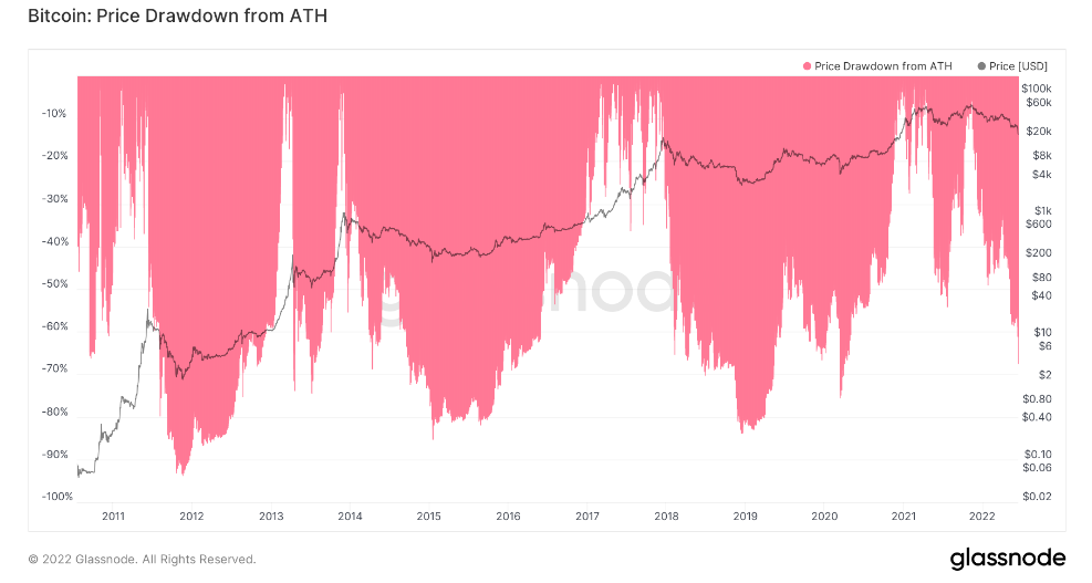 L’attuale drawdown di Bitcoin dal suo massimo storico di novembre è ora di circa il 70%. Come possiamo vedere dal grafico seguente, i bear market di Bitcoin hanno visto i prezzi scendere dal 70% al 90%. La storia ci dice quindi che potrebbero esserci ulteriori perdite.