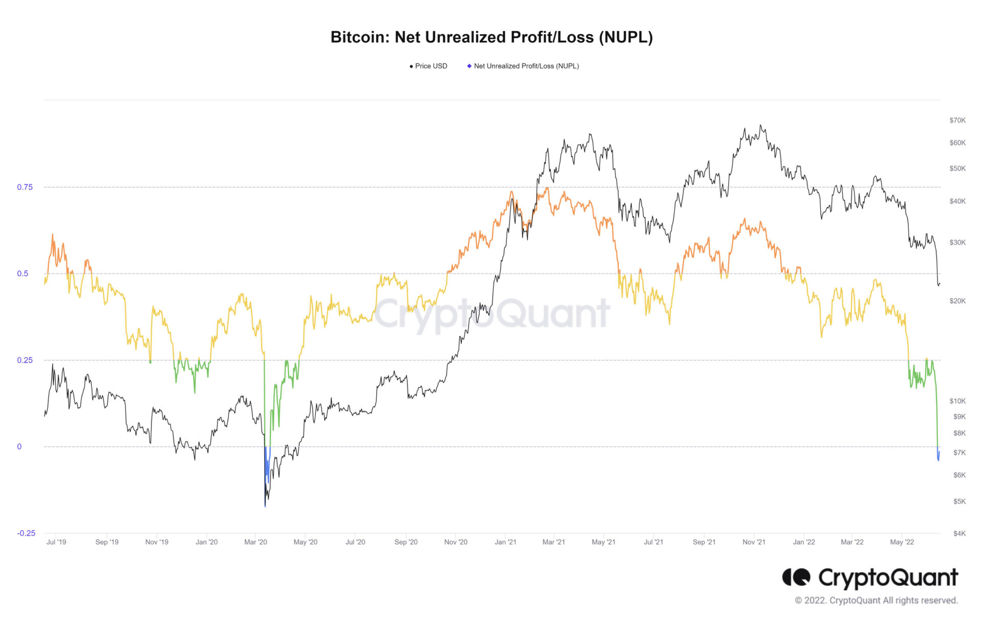 A partire da diverse metriche on-chain che misurano la capitolazione e la redditività dei detentori di criptovalute, in particolare il rapporto Net Unrealized Profit/Loss (NUPL) per BTC, possiamo vedere che l’ultimo drawdown ha spinto questo rapporto al livello più basso da marzo 2020. Chiaramente, molti detentori stanno soffrendo perdite su gran parte delle loro partecipazioni in criptovalute.