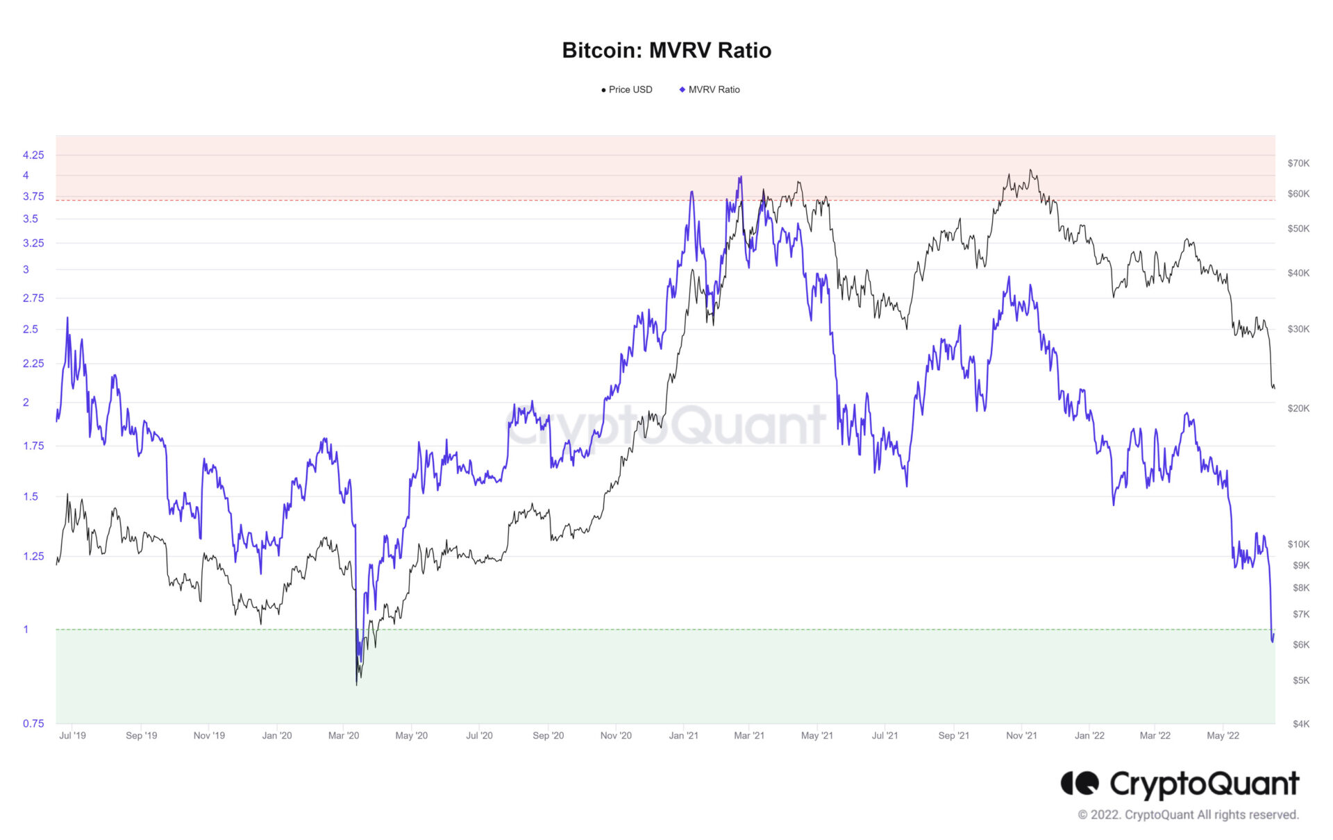 Un’altra misura popolare della redditività è il rapporto tra valore di mercato e valore realizzato (MVRV), che ancora una volta funge da proxy per la posizione media di profitto o perdita degli investitori. Il rapporto MVRV si avvicina ai livelli di marzo 2020. Ancora una volta, è importante ricordare che i cicli passati hanno visto tali misure rimanere a livelli depressi per molti mesi.