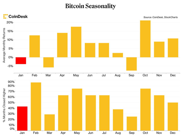 In quanto asset di rischio, gli investitori devono adeguare le proprie aspettative e comprendere come si comportano le criptovalute durante le flessioni del ciclo di liquidità. Ancora una volta, entrambi suggeriscono agli investitori di rimanere per il momento sottoesposti a tali asset. Anche la stagionalità sta confermando questo messaggio. Il periodo da giugno a settembre tende ad essere il meno favorevole per le criptovalute.