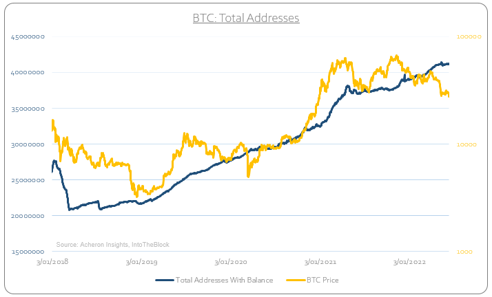 In termini di attività di rete, ciò che è incoraggiante per la fattibilità a lungo termine delle criptovalute come asset class funzionale è il modo in cui continuiamo a vedere aumentare il numero di indirizzi di rete totali anche se il prezzo è in caduta libera.
