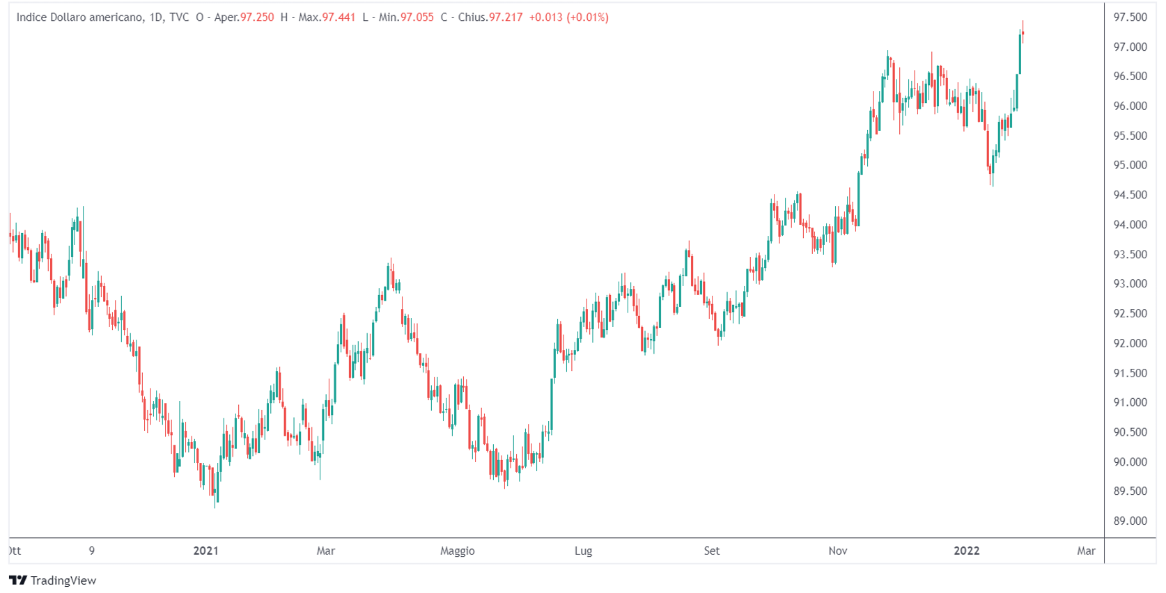 In quel periodo il dollaro americano ha scontato l’aggressività della Federal Reserve e il tapering. Dopo i tre impulsi rialzisti iniziati a marzo, il dollaro ha cominciato a lateralizzare. Con l’uscita del CPI al 7% è riuscito a rompere una resistenza importante al ribasso. Tuttavia, con l’ultimo meeting della Fed, il dollaro è riuscito a rompere la resistenza a 96.90.