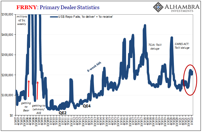 Sfortunatamente, l’unica vera fonte di dati sui repo fails è la Fed di New York, che raccoglie dati incompleti che riguardano solo i primary dealer, lasciando fuori la maggior parte del repo market. Inoltre, i loro dati non separano i repo fails classici (cash contro collaterale) da quelli “trasformati” (collaterale contro collaterale).