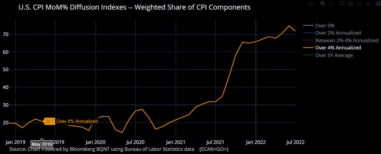 Segnali positivi arrivano dalla misura dell’ampiezza dell’inflazione. La lettura di luglio ha mostrato che il 71,8% del paniere del CPI sta aumentando a oltre il 4% su base annualizzata dei dati mese su mese, in calo dal massimo di giugno del 74,8%.