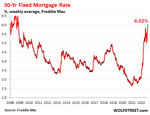 Il tasso fisso medio per i mutui a 30 anni è salito al 6,42%, secondo la misura di Mortgage News Daily, che tiene traccia dei tassi ipotecari su base giornaliera. La misura settimanale di Freddie Mac, pubblicata giovedì scorso e che riflette i tassi ipotecari all’inizio della settimana, ha raggiunto il 6,02%, il livello più alto da novembre 2008.