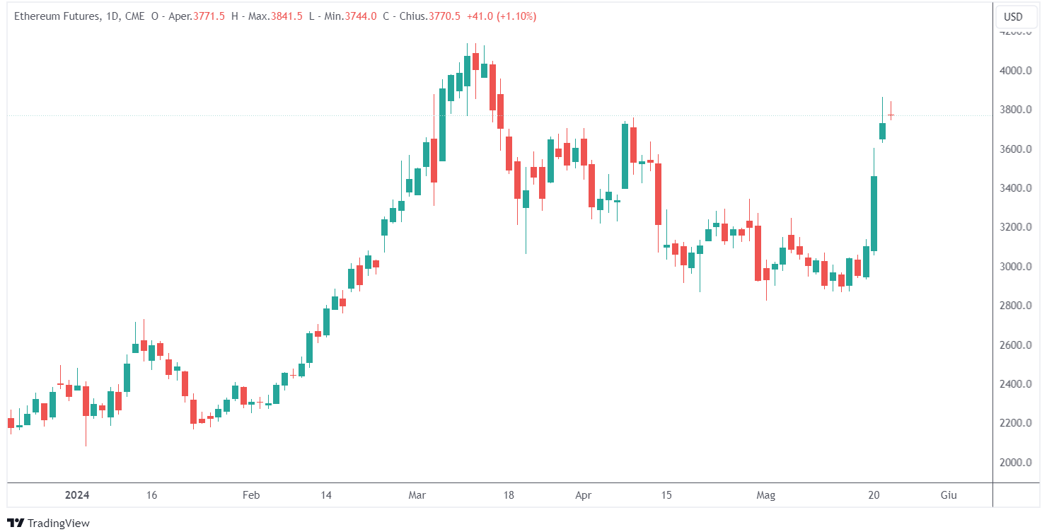 Ether, il token nativo della blockchain Ethereum, ha visto un aumento del 23% questa settimana, con un prezzo che ha superato i 3.800 dollari. Gli analisti di Standard Chartered, prevedono afflussi significativi verso ETH, stimando che gli ETF spot su Ethereum possano portare tra i 15 e i 45 miliardi di dollari nei primi 12 mesi dopo l’approvazione. Questo scenario è simile a quanto accaduto con gli ETF spot su Bitcoin, che hanno visto afflussi netti di quasi 13 miliardi di dollari e hanno accumulato quasi 59 miliardi di dollari in asset dalla loro introduzione nel gennaio 2024.