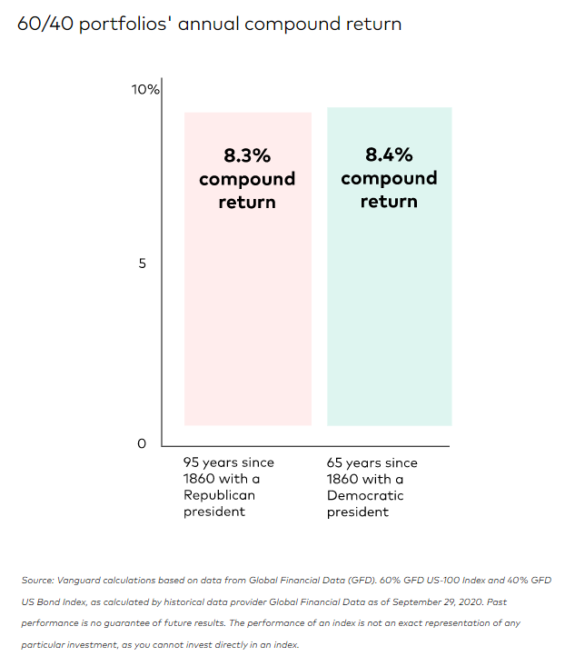 Il differenziale di rendimento storico tra le amministrazioni repubblicane e democratiche è praticamente inesistente. Lo spread tra i rendimenti composti annuali di un portafoglio 60/40 delle due parti sono inferiori all’1%. Nei 95 anni dal 1860, il rendimento medio con un presidente repubblicano è stato dell’8,3% e dell’8,4% nei 65 anni con un presidente democratico.