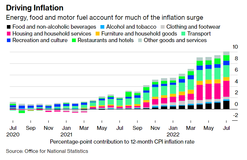 L’inflazione a doppia cifra nel Regno Unito aggiunge pressione alla Bank of England. L’indice dei prezzi al consumo ha raggiunto il livello più alto degli ultimi 40 anni, aumentando del 10,1% a luglio rispetto all’anno precedente. A giugno il CPI era aumentato del 9,4%.