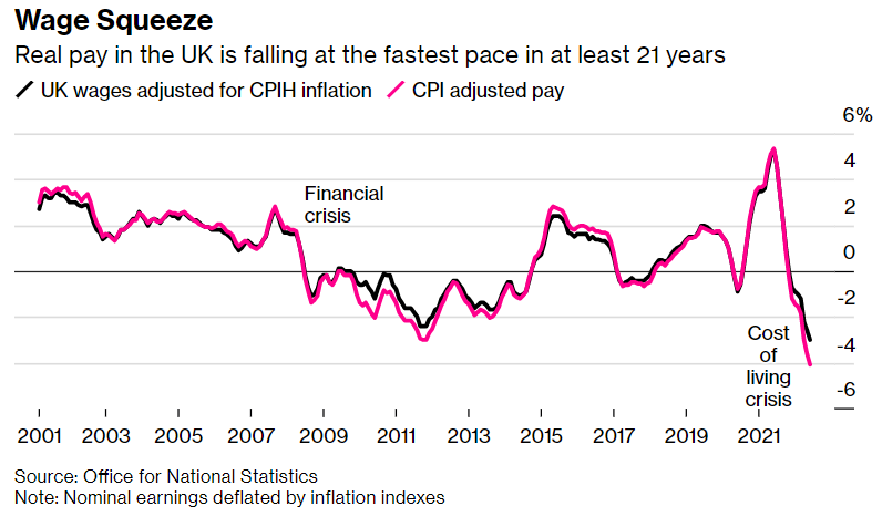 L’inflazione a doppia cifra sta davvero mettendo a dura prova i salari reali, anche con una forte crescita dei salari nominali. Ciò è destinato a peggiorare con l’aumento delle bollette energetiche in arrivo a ottobre. I salari reali aggiustati all’inflazione sono scesi del 3% in tre mesi, il ritmo più veloce dall’inizio della raccolta dei dati nel 2001.