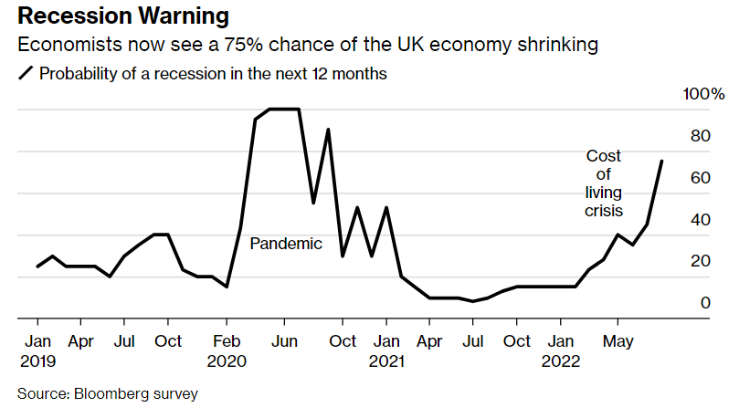 Gli economisti stanno diventando sempre più pessimisti sull’economia del Regno Unito. Adesso il rischio di una recessione è considerato molto più alto. Secondo un sondaggio di Bloomberg, la probabilità di una recessione nei prossimi 12 mesi è del 75%, in forte aumento rispetto al 44% di inizio luglio e superiore a qualsiasi altro periodo da settembre 2020.
