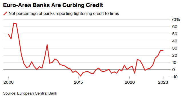 Le banche europee hanno frenato i prestiti più del previsto dopo che i costi di indebitamento sono aumentati e le turbolenze hanno attanagliato il settore finanziario. Gli standard di credito si sono inaspriti in modo sostanziale nel primo trimestre, secondo il Bank Lending Survey della BCE, pubblicato martedì. Il sondaggio è il primo a offrire indicazioni concrete sugli effetti a catena del fallimento della Silicon Valley Bank e della successiva acquisizione di Credit Suisse da parte di UBS.