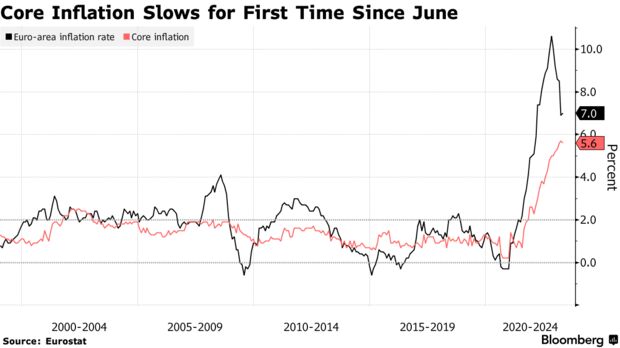L’inflazione core in Eurozona è diminuita per la prima volta in 10 mesi, sostenendo l’ipotesi che la Banca centrale europea rallenti la più aggressiva campagna di rialzo dei tassi di interesse della sua storia alla fine di questa settimana.
