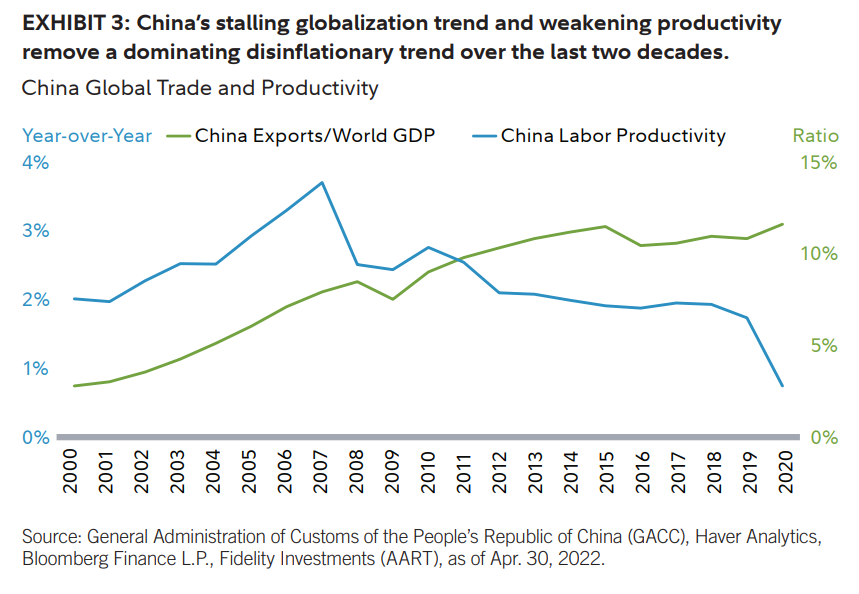 La produttività dei mercati sviluppati è stata anemica negli ultimi decenni. L’effetto inflazionistico è stato compensato da guadagni di produttività altrove, in particolare in Cina. L’impulso disinflazionistico derivante da maggiori guadagni di produttività in Cina è stato esportato in tutto il mondo attraverso l’aumento dei legami commerciali globali. La globalizzazione in stallo e l’indebolimento della produttività cinese potrebbero invertire la tendenza disinflazionistica dominante negli ultimi due decenni.