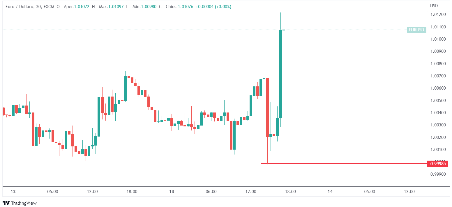 L’euro ha toccato brevemente la parità con il dollaro, toccando un minimo di 0.9998 $. Da lì ha rimbalzato con vigore.