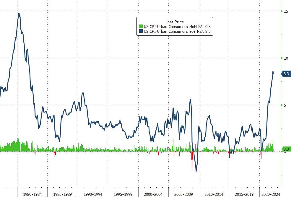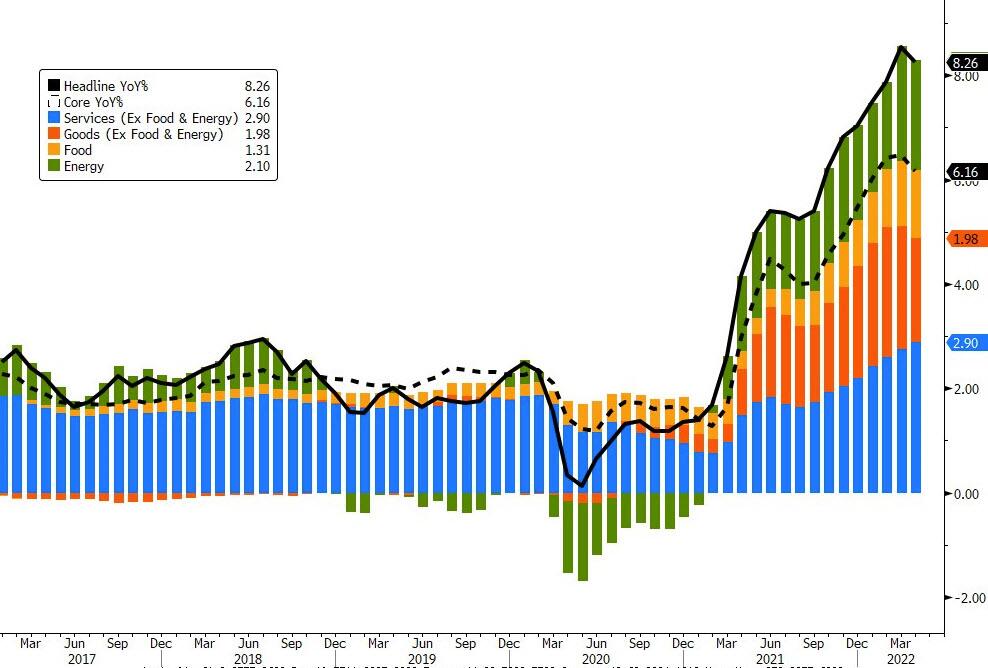 E’ incoraggiante vedere che l’inflazione USA è diminuita ad aprile su base annuale. Resta però il fatto che è rimasta inaccettabilmente alta. Il consenso degli analisti era per un forte rallentamento del CPI dal +8,5% YoY al +8,1%. Tuttavia, il CPI è risultato più caldo del previsto al +8,3%. Ciò rappresenta la seconda lettura più alta dal 1982.