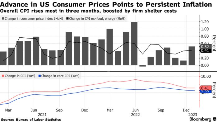 Le stime mediane in un sondaggio Bloomberg di economisti prevedevano un aumento mensile dello 0,5% nel CPI e un aumento dello 0,4% nel core CPI. Entrambe le misure annuali sono state superiori alle attese e hanno mostrato una decelerazione molto più lenta rispetto agli ultimi mesi.