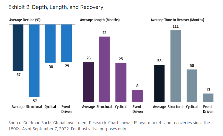 I mercati ribassisti secolari o strutturali hanno drawdown più profondi, in media del 60% e sono prolungati (possono impiegare fino a un decennio per riprendersi completamente). Ciò che distingue un mercato ribassista strutturale da uno ciclico è la presenza di squilibri finanziari significativi. Nella maggior parte dei mercati ribassisti strutturali, la leva finanziaria del settore privato è estremamente elevata.