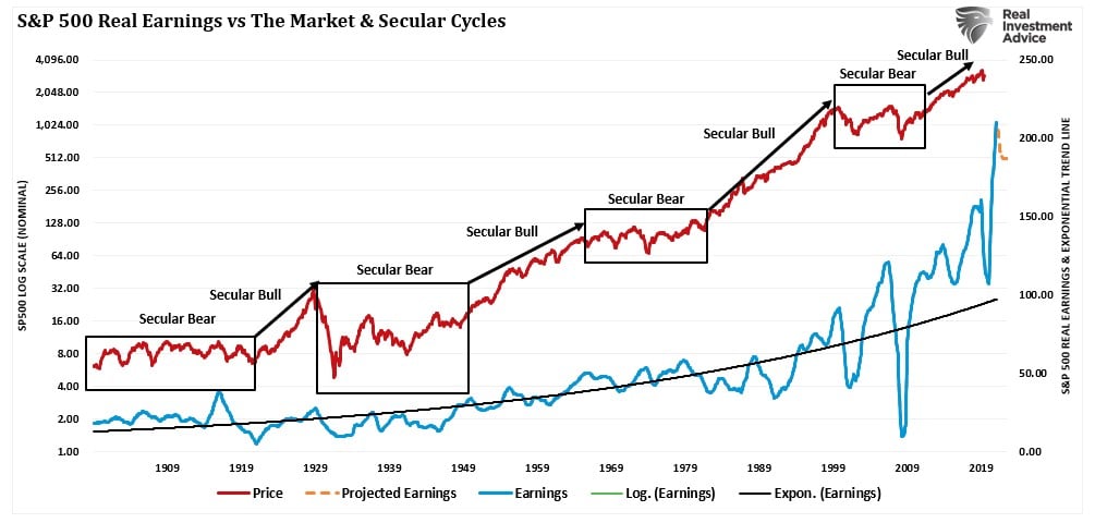 Dal grafico sottostante che mostra i cicli secolari del mercato dal 1871 ad oggi, si nota che i mercati rialzisti iniziano con valutazioni CAPE di circa 10 volte gli utili o inferiori. Al contrario, i mercati ribassisti secolari tendono a iniziare con valutazioni di 23-25 volte gli utili o superiori.