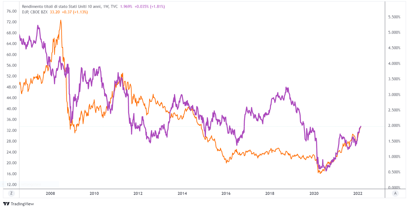 Anche le obbligazioni hanno una correlazione inversa con le materie prime; questo perché quando le materie prime salgono aumenta l’inflazione. Il risultato è la discesa delle obbligazioni dovuto a rendimenti obbligazionari più alti che scontano l’aumento dell’inflazione. C’è infatti una correlazione inversa tra il prezzo delle obbligazioni e i loro rendimenti.