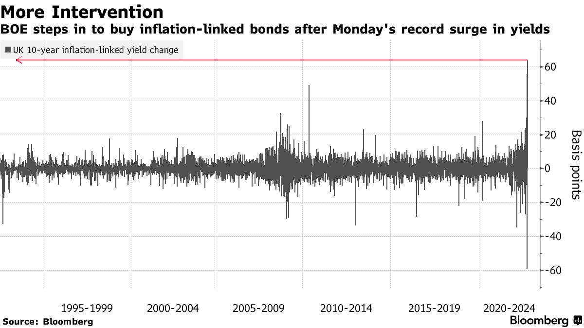 Ieri la Bank of England è stata costretta ad intervenire per stabilizzare il mercato dei gilts, rendendo nota l’intenzione di ampliare il suo programma di acquisto ai titoli di Stato indicizzati all’inflazione. Questa è già la seconda volta che la banca centrale del Regno Unito è intervenuta per salvare i mercati nelle ultime due settimane.