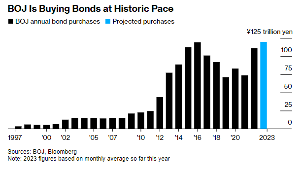 La modifica della BOJ consente ai rendimenti obbligazionari di salire oltre l’1%. Ciò riduce le armi di acquisto di obbligazioni che la BOJ deve utilizzare in difesa del suo programma di controllo della curva dei rendimenti. La banca centrale è sulla buona strada per eguagliare o addirittura superare il record di acquisti annuali di obbligazioni di 119 trilioni di yen nel 2016, un importo considerato all’epoca insostenibile.