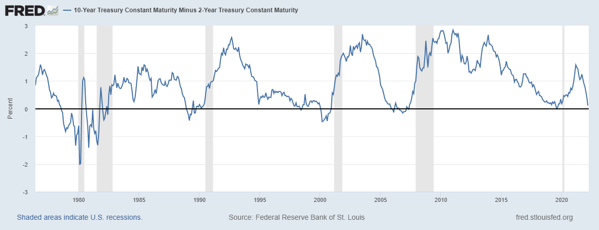 La parte della curva dei rendimenti dei Treasury su cui gli investitori si focalizzano di più è rappresentata dallo spread tra i rendimenti a 10 anni e quelli a 2 anni. Quando l’economia è in stato di salute, i tassi di interesse sono molto più elevati sulle lunghe scadenze e la curva assume una pendenza ripida. In un’economia in crescita, gli investitori richiedono rendimenti più elevati all’estremità lunga della curva per tenere fermi i loro soldi piuttosto che investirli su altri tipi di asset.