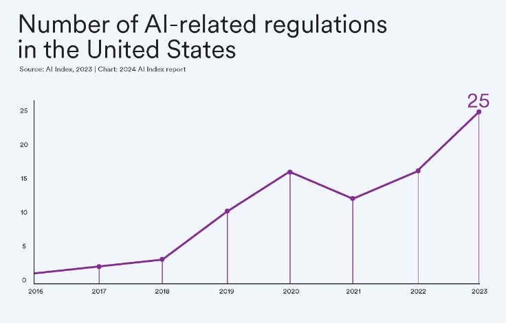 Le normative emergenti sull’AI stanno aumentando sia negli Stati Uniti che nell’Unione Europea, influenzando le strategie aziendali e gli investimenti futuri​. Ad esempio, il numero di regolamenti relativi all’AI negli Stati Uniti è aumentato del 56,3% nel 2023, segnalando una crescente attenzione del governo alla governance dell’AI. Questo aumento delle normative potrebbe comportare ulteriori costi di conformità per le aziende e influenzare la loro capacità di innovare​.