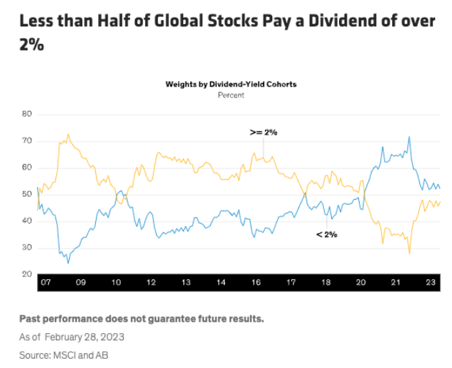Il divario tra le società ad alta crescita e le dividend stocks tradizionali sta modificando il comportamento dell’universo dei dividendi azionari, che agisce in modo più difensivo del solito, con una sensibilità al mercato azionario più ampio in costante calo. Questa caratteristica ha aiutato nel mercato ribassista del 2022, ma è probabile che riduca la partecipazione al rialzo quando i mercati offriranno rendimenti più elevati. Ciò è stato vero nel rally del 2020, quando le azioni con dividendi hanno sottoperformato di circa il 16%.