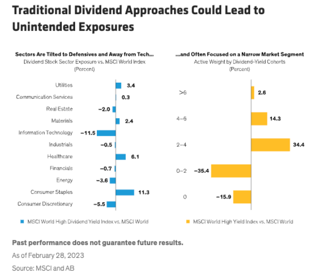 Le strategie di investimento in dividendi hanno una sovraponderazione strutturale ai beni di consumo di base e alla sanità e soprattutto una sottoponderazione alla tecnologia. Un approccio più sistematico all’investimento in dividendi può contribuire a ridurre la concentrazione settoriale.
