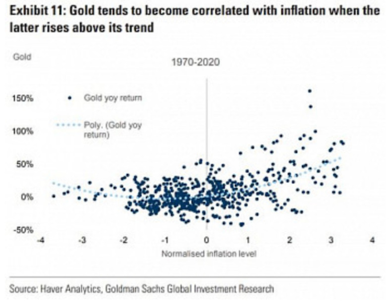 Il rapporto tra oro e inflazione non è lineare nel tempo. Il metallo tende a non mostrare una correlazione molto forte con l’inflazione quando essa è moderata. Tuttavia, la correlazione è forte quando l’inflazione supera una certa soglia.
