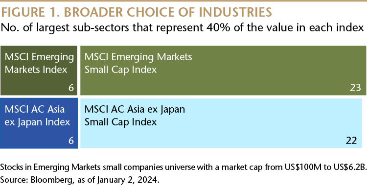 Un’altra delle loro caratteristiche è l’elevato grado di diversificazione che possono offrire. Le small cap sono presenti in una moltitudine di settori e industrie, offrendo agli investitori il potenziale per ottenere esposizione a temi nascenti e in rapida crescita. Nell’indice MSCI Emerging Markets, ad esempio, circa il 40% del valore risiede in sei sottosettori. In confronto, il 40% dell’indice MSCI Emerging Markets Small Cap è suddiviso in 23 sottosettori.