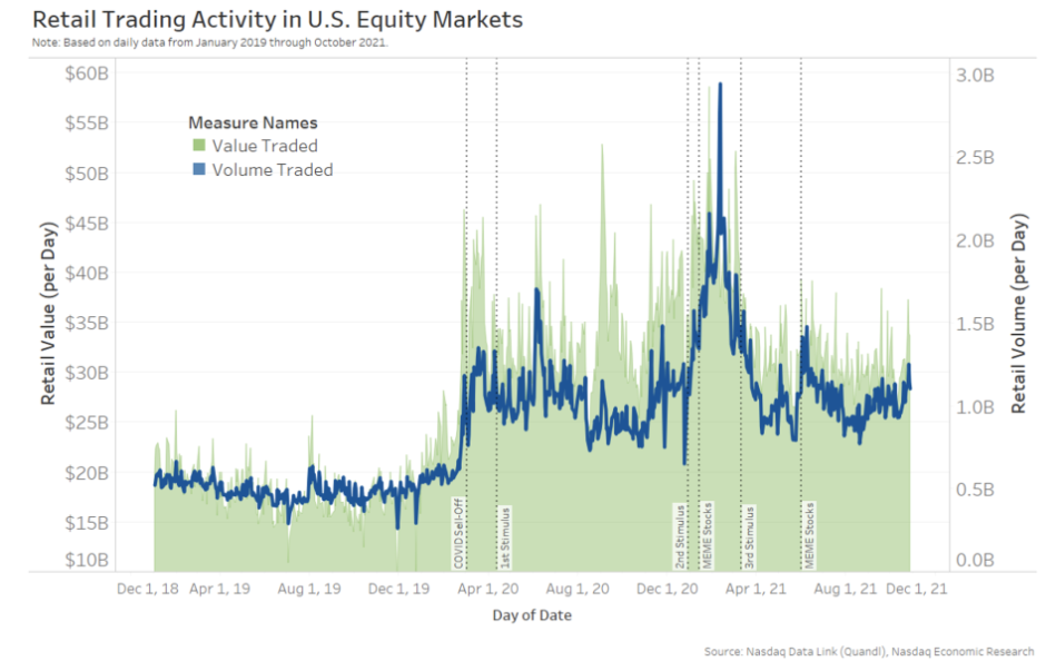 L’influenza sui mercati degli investitori al dettaglio ha iniziato a crescere già a dicembre 2019, quando la maggior parte dei broker al dettaglio ha ridotto le commissioni a zero. Quando il Covid ha colpito nel marzo 2020, l’attività è aumentata rapidamente, passando a quasi il doppio dei livelli pre-pandemia.
