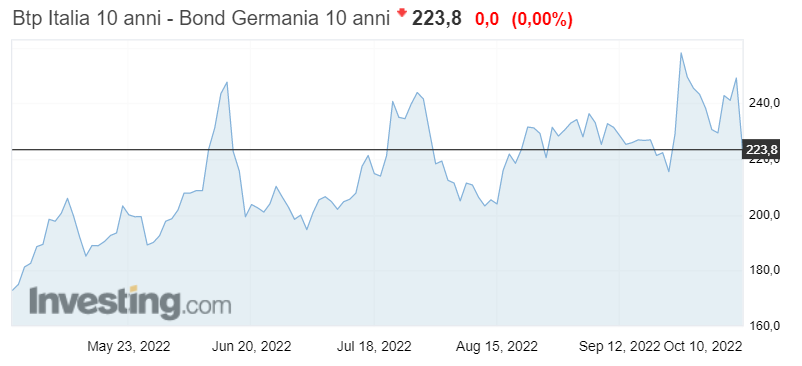I rendimenti delle obbligazioni italiane a 10 anni sono più che quadruplicati quest’anno, raggiungendo il 4,7%. Ma è nel debito con scadenza più breve che si fa davvero sentire il dolore dell’aumento dei tassi ufficiali della BCE. I rendimenti a tre anni, negativi all’inizio dell’anno, sono ora superiori al 3,5%. Gli oneri finanziari salgono a oltre il 4% per i debiti con scadenza a cinque anni e oltre. Il differenziale di rendimento a 10 anni tra Italia e debito tedesco ha raggiunto i 250 punti base alla fine di settembre per poi scendere.