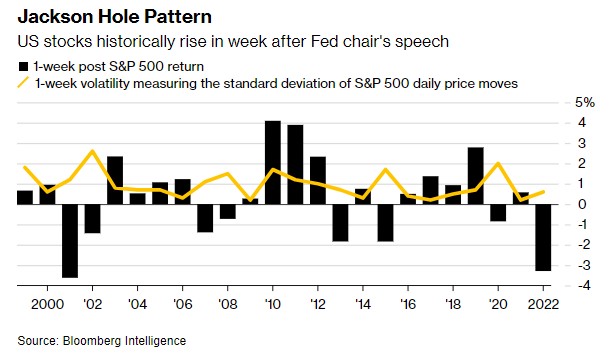 I discorsi dei presidenti della Fed al simposio di Jackson Hole hanno generalmente sostenuto le azioni statunitensi dall’inizio del millennio. L’S&P 500 ha guadagnato in media lo 0,4% nella settimana successiva al discorso del presidente della Fed all’evento.