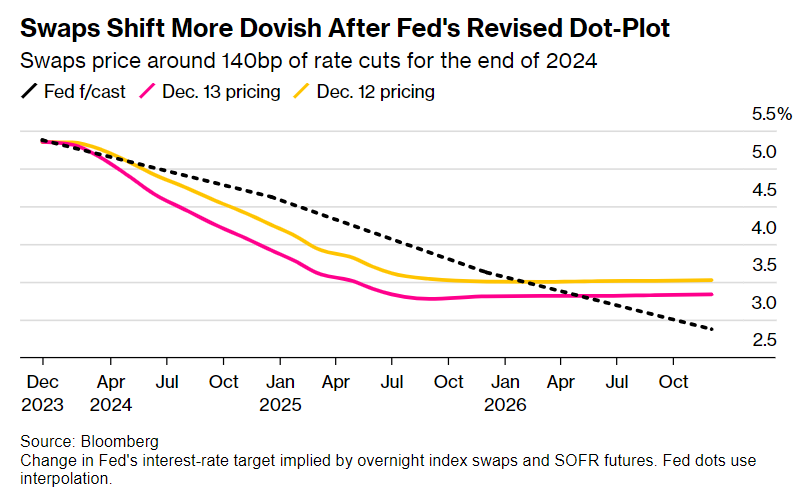 Anche se il presidente Jerome Powell ha dichiarato che la Fed sarà pronta a riprendere gli aumenti dei tassi se necessario, i funzionari hanno emesso previsioni che mostrano una serie di tagli nel 2024. La mancanza di resistenza da parte di Powell contro le aspettative degli investitori per i tagli dei tassi nel 2024 ha contribuito a far aumentare i titoli di Stato e le azioni.