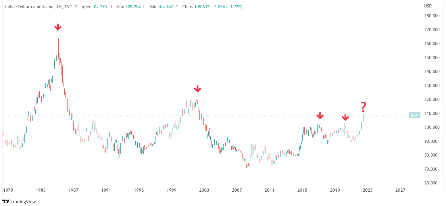 La forza del dollaro è cominciata quando era chiaro che la Federal Reserve avrebbe dovuto iniziare ad inasprire la politica monetaria per via dell’inflazione. La narrativa dell’inflazione “transitoria” è svanita già nel febbraio 2021. Non è un caso che quel mese molti titoli speculativi abbiano raggiunto il picco e che il dollaro abbia cominciato ad acquisire forza.