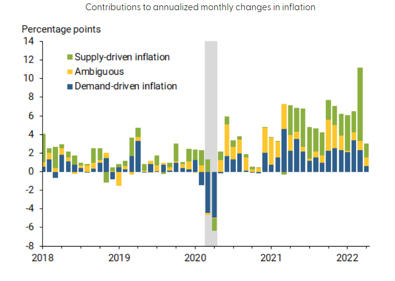 Nel frattempo, nell’aprile 2021 hanno iniziato a manifestarsi i fattori dell’offerta, indicando una risposta leggermente ritardata dalla riapertura dell’economia. L’inflazione guidata dall’offerta è rimasta elevata da allora e ha subito un’accelerazione recentemente. Questa accelerazione è attribuibile alle interruzioni dell’approvvigionamento alimentare ed energetico, comprese quelle associate all’invasione dell’Ucraina.