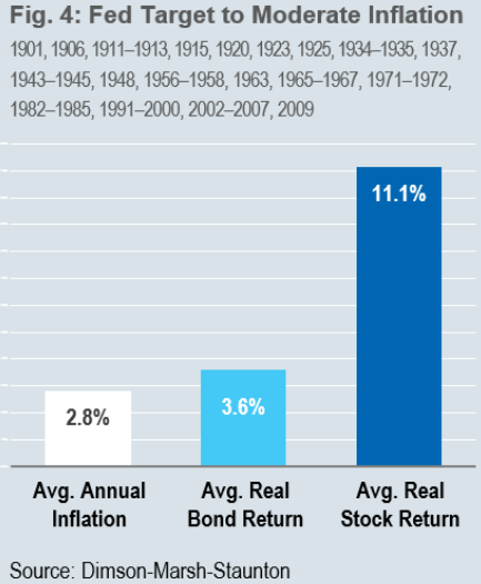 Le obbligazioni e le azioni statunitensi hanno rendimenti positivi durante i periodi di inflazione moderata. Le obbligazioni hanno ottenuto un rendimento reale medio del 3,58% mentre quello delle azioni è stato pari all’11,14%.