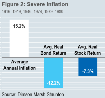 L’inflazione elevata porta performance obbligazionarie negative, con una perdita reale media del 2,84%. Le obbligazioni hanno avuto rendimenti positivi in ​​sei dei 20 anni caratterizzati da alta inflazione (il 30% delle volte).