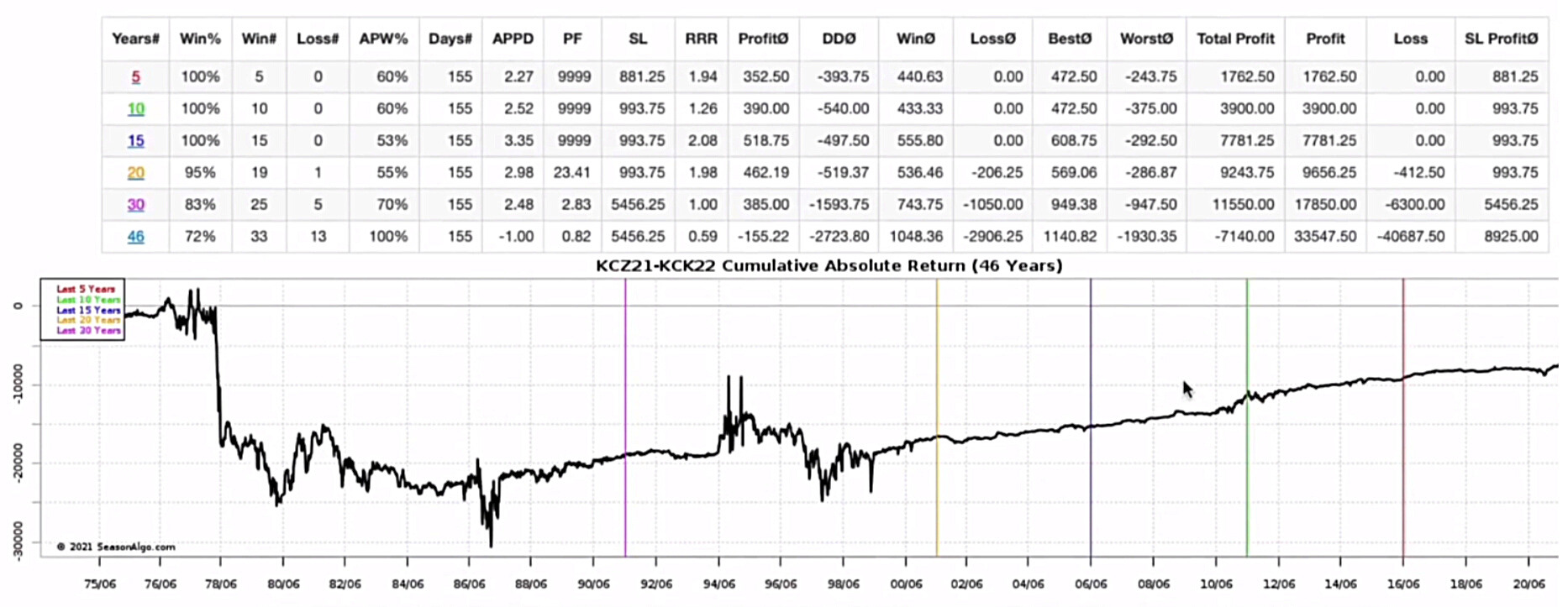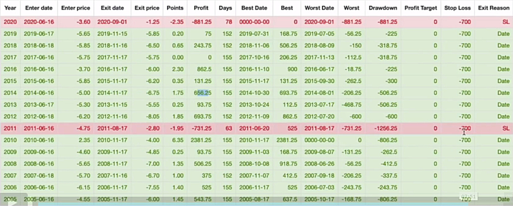 Come si può notare, dal 2005 in poi solamente 2 volte, con stop loss fisso a -700$, il trade sarebbe andato in perdita (nel 2011 e nel 2020).