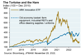 Il 2022 è stato un anno in cui le società non redditizie sono state rivalutate. Durante lo stimolo pandemico, le aziende ad alta crescita avevano un prezzo irrealistico. Ora che la politica monetaria e quella fiscale si stanno normalizzando, le aziende tech senza profitti stanno sottoperformando i titoli della “Old Economy”.