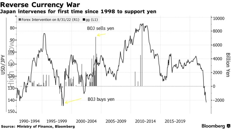 Il Giappone è intervenuto per sostenere lo yen per la prima volta dal 1998, cercando di arginare il calo del 20% rispetto al dollaro di quest’anno in mezzo a una divergenza politica sempre più ampia con gli Stati Uniti. Lo yen è la valuta peggiore del G-10 da inizio anno.