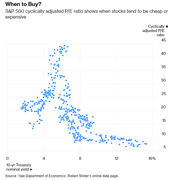 Il grafico successivo, che mostra il rapporto prezzo/utili corretto ciclicamente (CAPE ratio) dell’S&P 500, fa luce sulle ragioni di questo andamento. Un CAPE ratio alto segnala azioni costose e viceversa. Il CAPE ratio generalmente diminuisce con l’aumento dei rendimenti a lungo termine.